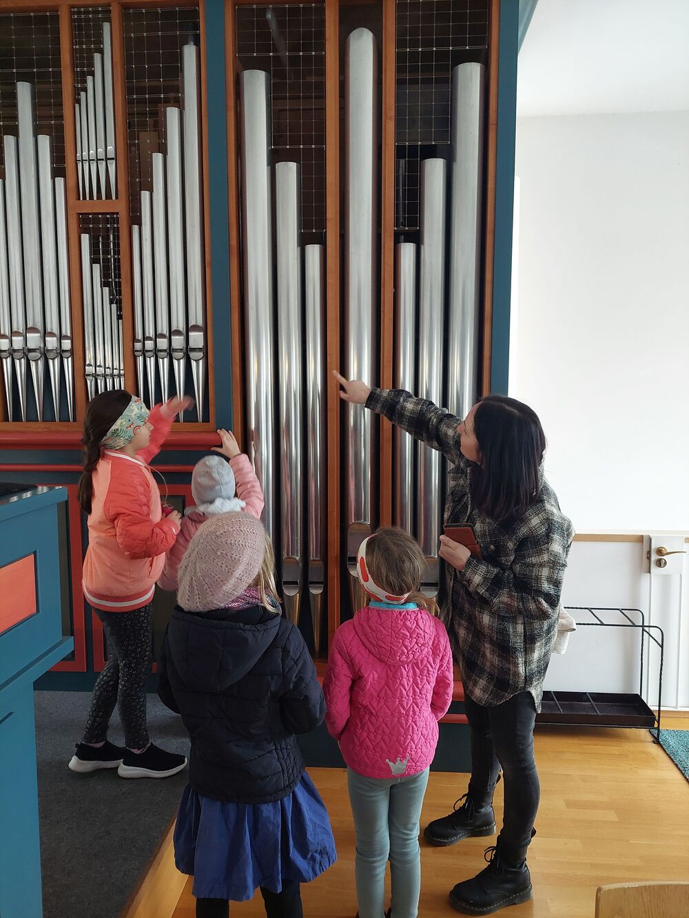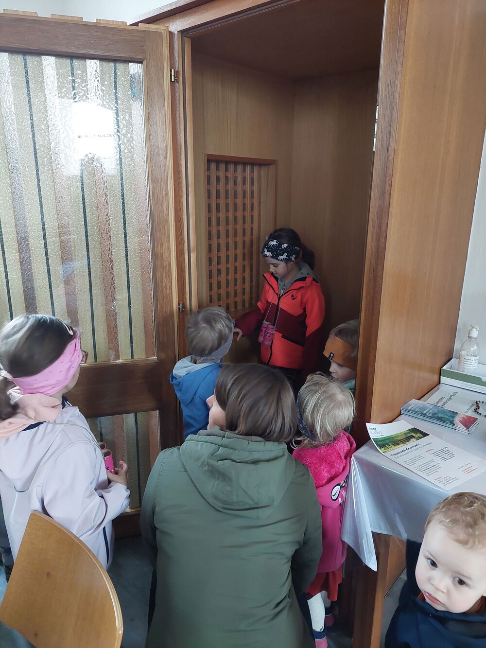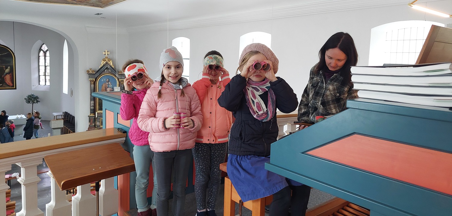 Ein Blick durch das selbstgebastelte Fernrohr und dann ging es los auf Entdeckungstour durch die Kirche. In Gruppen besuchten die Kinder die verschiedensten Stationen. Die Sakristei wurde von Dietmar Hirschbühl erklärt, Pfarrer Ratz ließ die Augen beim neuen Taufbecken, der Osterkerze sowie dem Altar strahlen. Sandra stimmte mit den Kindern die Orgel an und mit Anna wurden bei den Opferkerzen Wünsche zu Gott gesendet und den Beichtstuhl begutachtet. Zum Abschluss durften die Erstkommunionskinder noch den Kirchturm erklimmen.